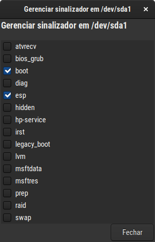 No calamares normalmente tem no momento de criar a partição (flags), mas você pode fazer pelo gparted, selecione a partição /boot/efi clique com o botão direito->manage flags e marque esp, boot.