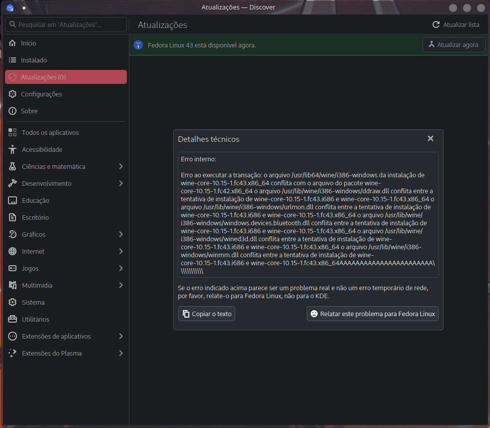 Ao tentar fazer a atualização do fedora 42 KDE Plasma para o 43 usando o app do Discover perto do final esse erro aconteceu, alguém sabe como resolver esse conflito de arquivo?