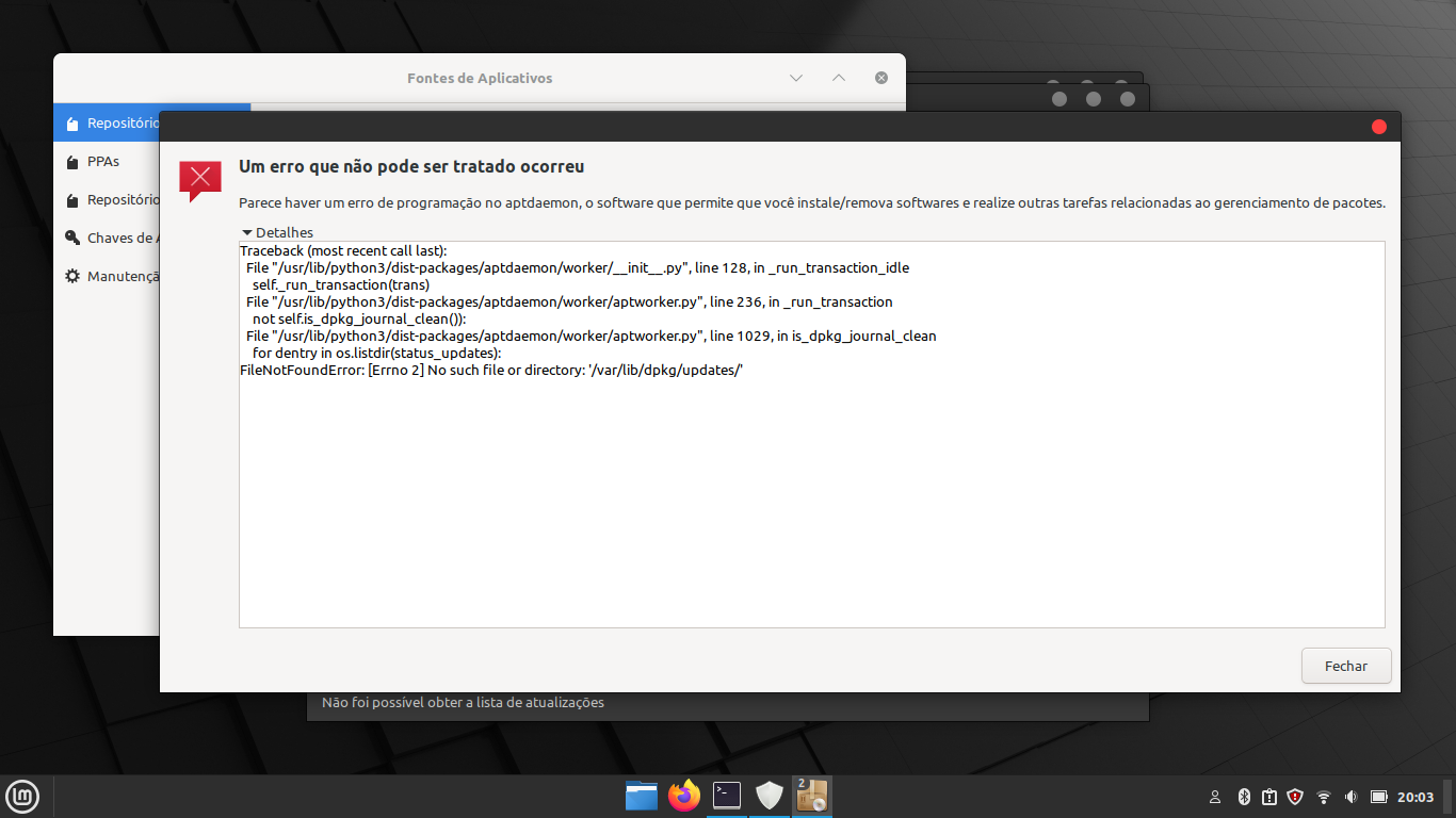 depois, vá em https://packages.ubuntu.com/, baixe o pacote “python3-aptdaemon” para a versão do ubuntu do mint e instale via terminal: