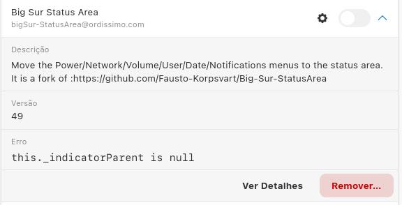 Eu sempre usei a extensão ‘BigSur Status Area’ no Ubuntu, agora passei a usar o popOS 22.04 e aparece esse erro: “this._indicatorParent is null”