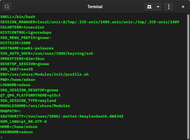 Você consegue ver o que consta no seu ambiente com env | less, isto mostra todas variáveis configuradas.