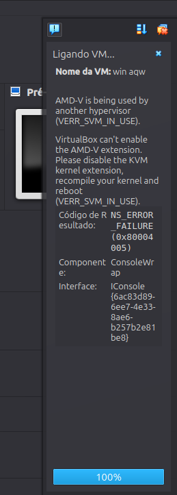 Toda vez que tento iniciar uma VM, aparece o seguinte erro e ela não inicia: