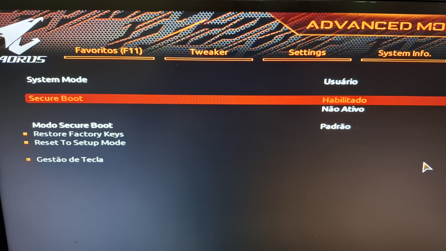 Vá pra baixo até Modo Secure Boot e coloque como Padrão