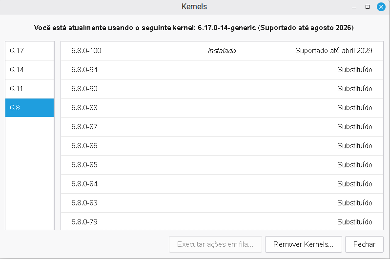 dkms: autoinstall for kernel 6.17.0-14-generic…fail!run-parts: /etc/kernel/postinst.d/dkms exited with return code 11dpkg: erro ao processar o pacote linux-image-6.17.0-14-generic (–configure):o subprocesso instalado, do pacote linux-image-6.17.0-14-generic, o script post-installation retornou erro do status de saída 11Erros foram encontrados durante o processamento de:linux-headers-6.17.0-14-genericlinux-headers-generic-hwe-24.04linux-generic-hwe-24.04linux-image-6.17.0-14-genericE: Sub-process /usr/bin/dpkg returned an error code (1)root@diego-Lenovo-ideapad-320-15IKB:/home/diego# apt-get autoclean && apt-get autoremoveLendo listas de pacotes… ProntoConstruindo árvore de dependências… ProntoLendo informação de estado… ProntoDel firefox-locale-en 147.0.3+linuxmint1+zena [597 kB]Del firefox-locale-pt 147.0.3+linuxmint1+zena [763 kB]Lendo listas de pacotes… ProntoConstruindo árvore de dependências… ProntoLendo informação de estado… Pronto0 pacotes atualizados, 0 pacotes novos instalados, 0 a serem removidos e 1 não atualizados.4 pacotes não totalmente instalados ou removidos.Depois desta operação, 0 B adicionais de espaço em disco serão usados.Configurando linux-image-6.17.0-14-generic (6.17.0-14.14~24.04.1) …Configurando linux-headers-6.17.0-14-generic (6.17.0-14.14~24.04.1) …/etc/kernel/header_postinst.d/dkms: