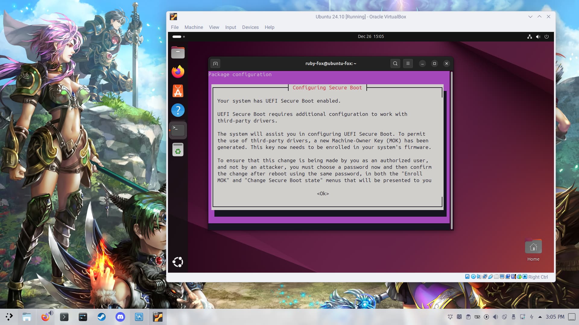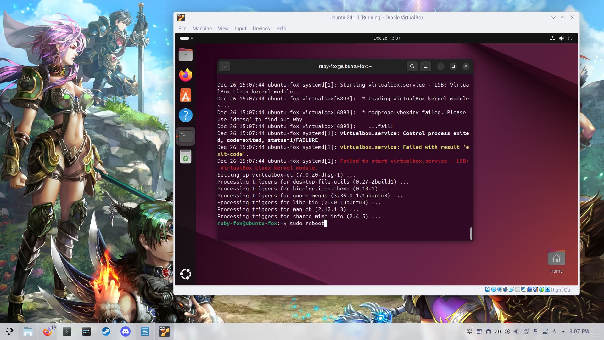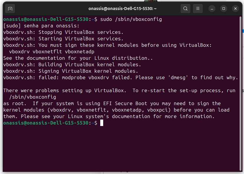 Então digitei o comando que pediu que foi o /sbin/virtualboxconfig