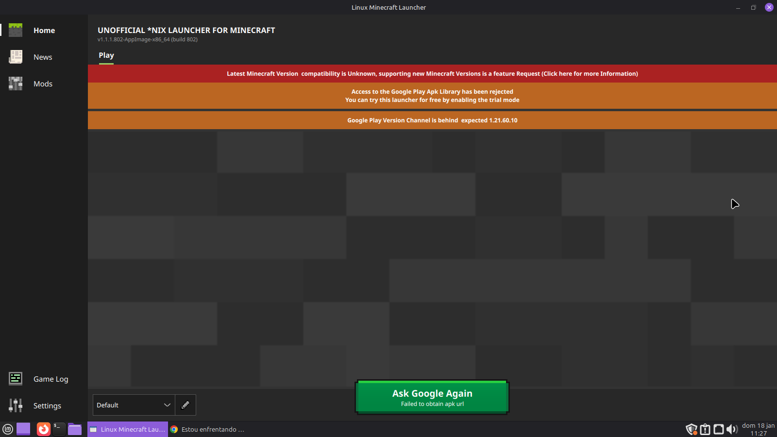 Está tentando instalar o Minecraft Bedrock pela Play Store? O Linux não suporta aplicativos Android, mas você pode tentar usar o Waydroid – provavelmente não vai conseguir pois o Mint não tem suporte adequado ao Wayland, então você teria que usar outra interface. Se escolher essa alternativa, recomendo o Zorin OS. Você também pode tentar usar o Genymotion, que é semelhante ao BlueStacks, mas não sei como ele funciona pois nunca utilizei.