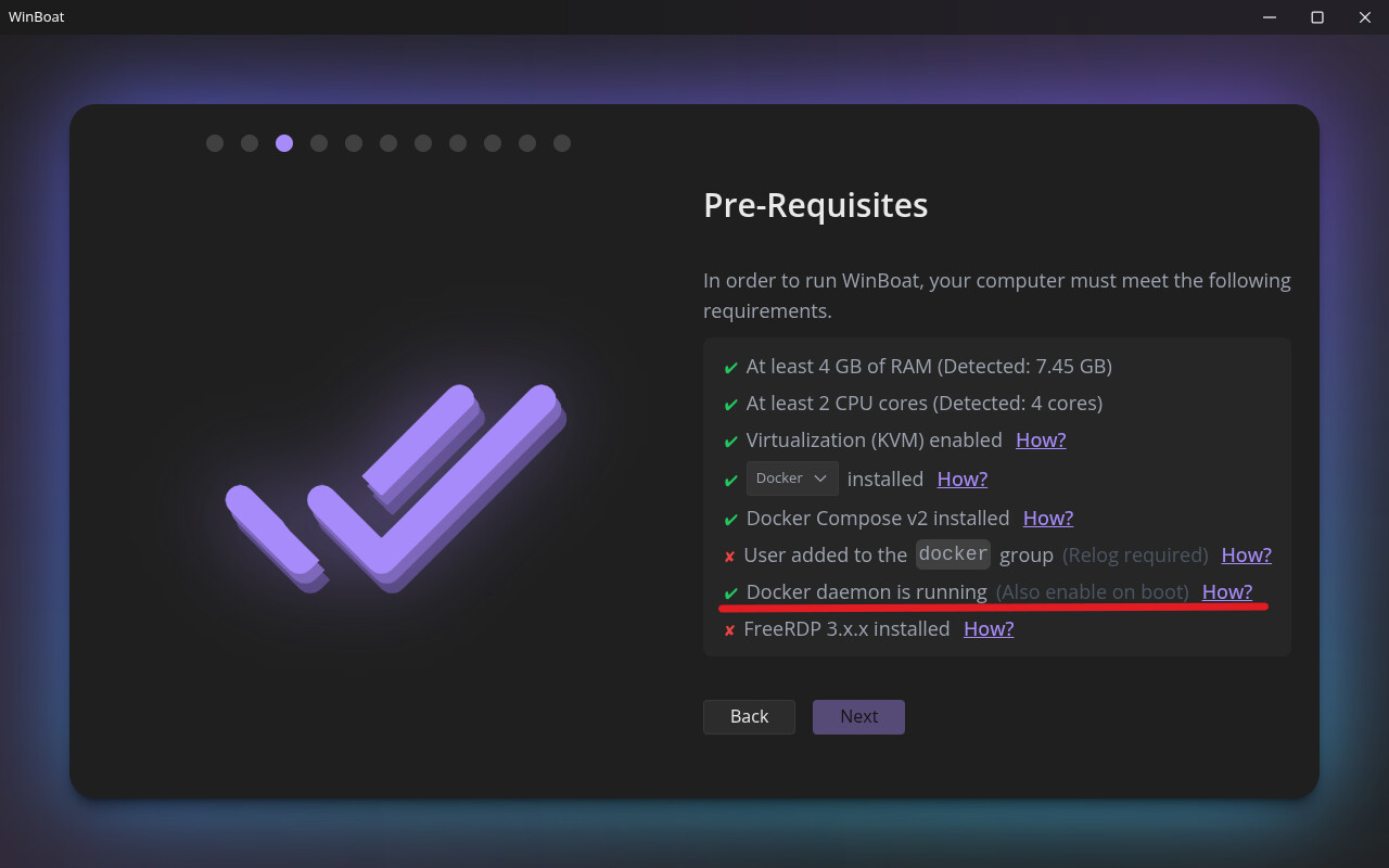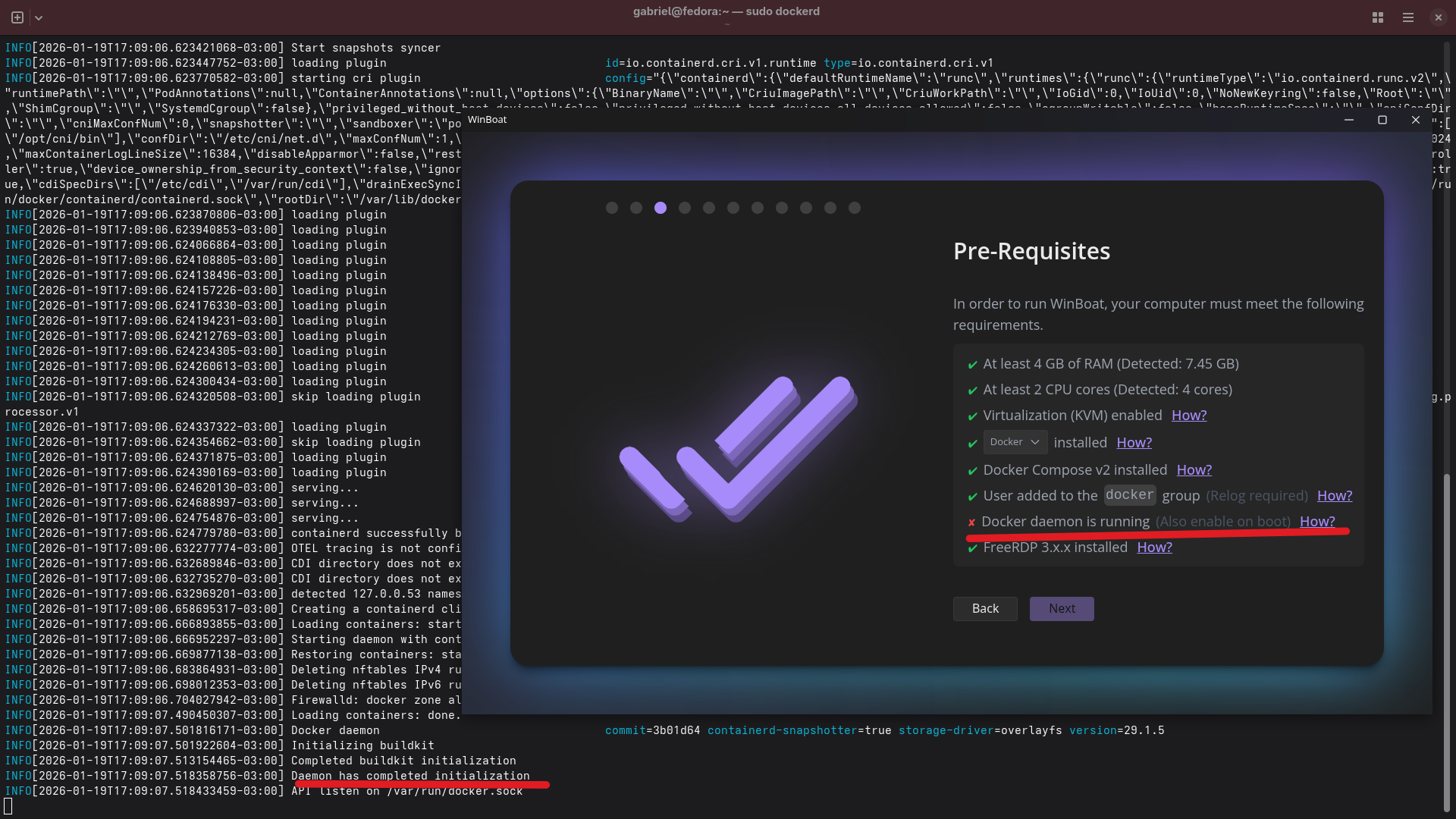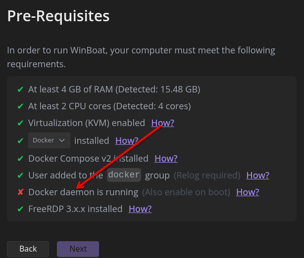 Quando eu executei os comandos para iniciar o daemon na inicialização, consegui iniciar o WinBoat. Tenta executar eles novamente e reinicia.