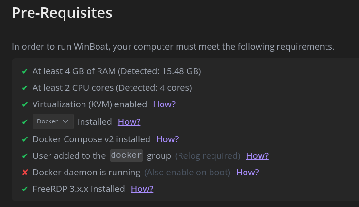 Você configurou para o Docker iniciar com a máquina? Se não, terá que iniciá-lo manualmente quando quiser usar o Winboat. Aqui eu deixei manual, pois não pretendo ficar usando o Winboat e está funcionando bem.