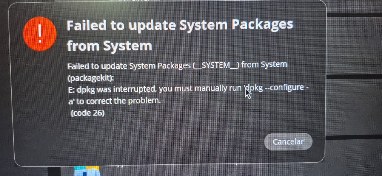 O gerenciador de pacotes dpkg foi interrompido no meio de uma atualização ou instalação (por exemplo, o PC foi desligado, travou, ou o apt/PackageKit foi fechado à força). Por segurança, o sistema bloqueia novas atualizações até você concluir manualmente a configuração dos pacotes pendentes.