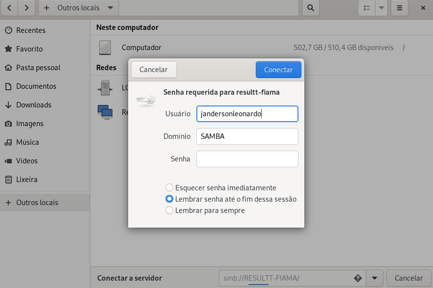 Caros colegas, através do Fedora 33 não consigo acessar a pasta compartilhada em rede de um computador servidor com Windows 10. Ao acessar via Samba, já previamente instalado e configurado conforme este passo-a-passo: samba-fedora-33 na tela que surge após a aba “Conectar a servidor” no gerenciador de arquivos do Fedora na parte Outros locais, onde digito smb://ip_do_servidor/ ou smb://ip_do_servidor/nome_da_pasta/ ou smb://nome_do_servidor/ ou smb://nome_do_servidor/nome_da_pasta/ ao pedir senha, digitá-la e clicar em conectar, fica num loop infinito nesta tela e não acessa as pastas em rede no servidor com Windows. O que fazer diante disto ou o que de errado eu tenho feito já que sou principiante no mundo Linux?