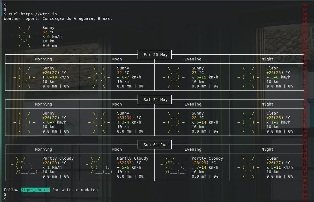 $ curl wttr.in/Brasilia?format="%l:+++%C+++%t\n%w+++%h+++%p+++UV+%u\n%S+--+Zenith+%z+--+%s\n"