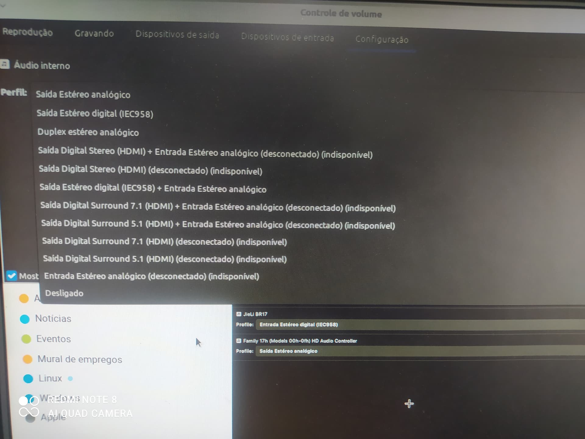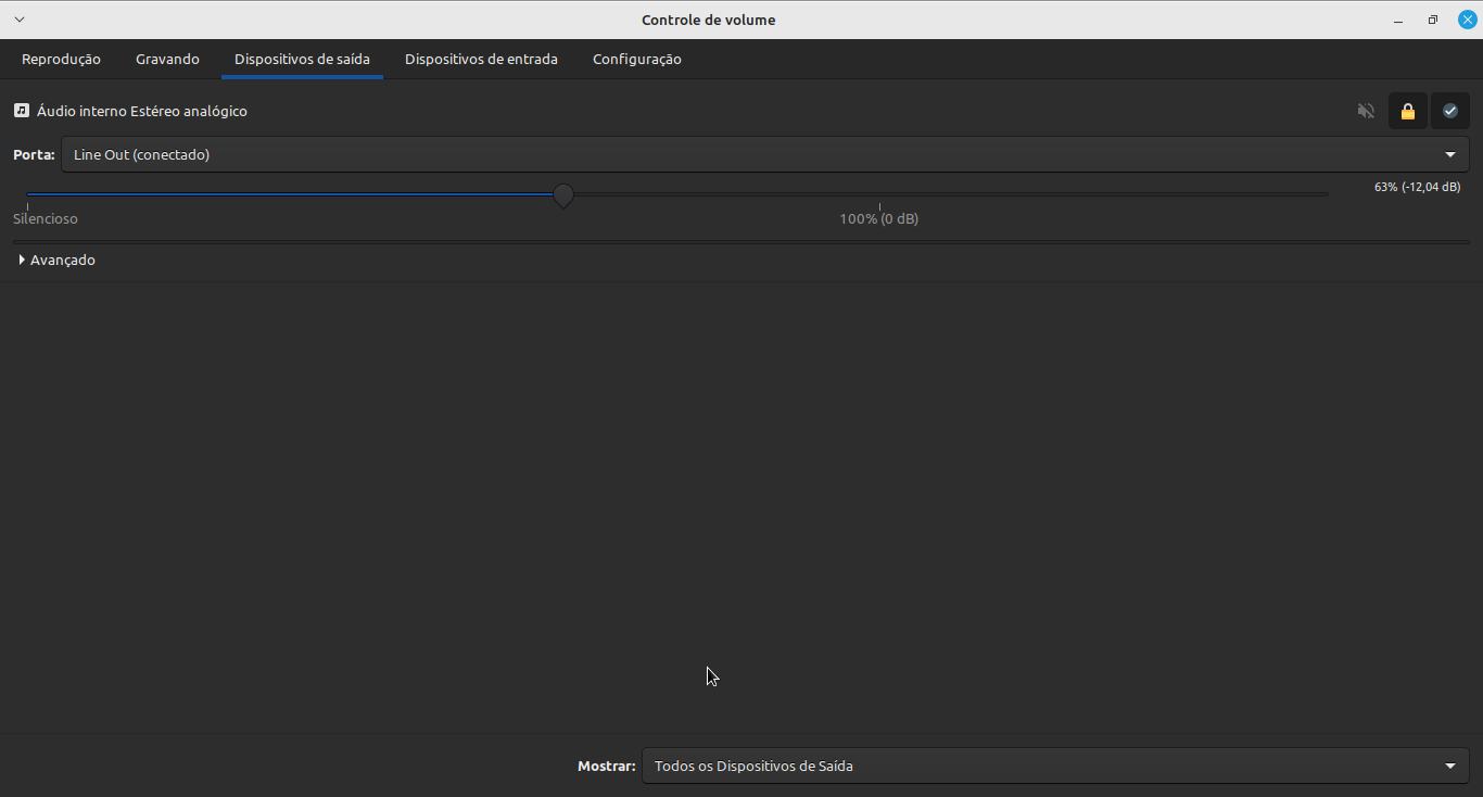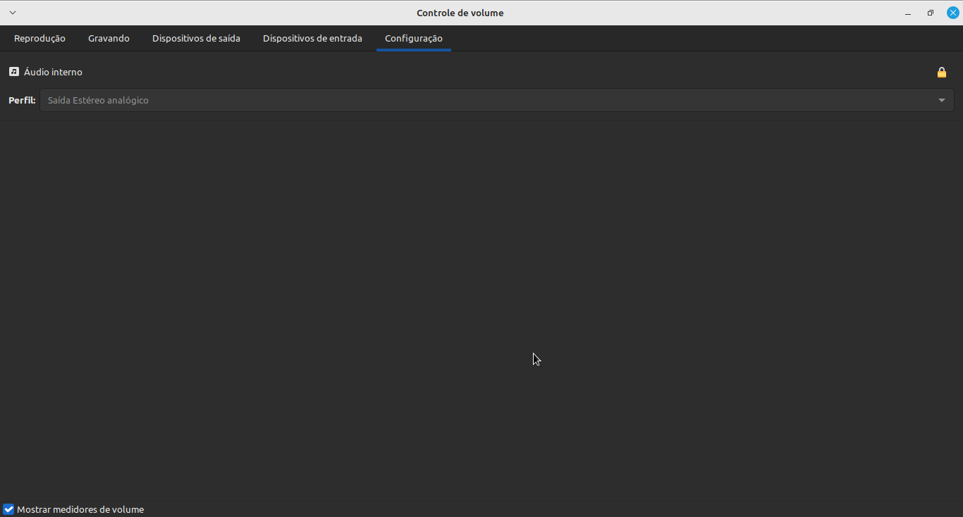 Se você maximizar o controlador de volume, verá do lado direito uma aba chamada Configurações, clique lá e tente alterar o perfil do Áudio interno Estéreo Analógico para um perfil diferente de Desconectado.