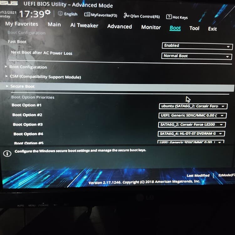 Esses dias mesmos eu estava com uma placa mâe/bios igual se não parecida à essa para “concerto”! Infelizmente eu não prestei muita atenção pois o problema era só uma limpeza no sistema e interna. Mas você poderia tirar uma foto do modo advanced? Pode ser que acha um bloqueio com o secure boot envolvido. Outra coisa, o modo de inicialização/instalação é EFI ou LEGACY? ja ouvi falar que só é possivel desabilitar o secure boot mudando isso ( para asus em especifico ).