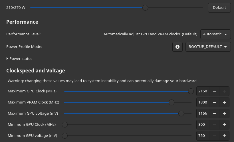 As placas AMD tem dessa que no Linux por padrão elas ficam capadas no clock e potência. Mas um toquezinho na customização e dá pra desbloquear todo o potencial da placa.