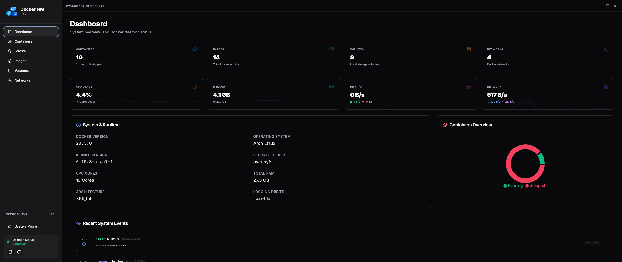 Faz-se um bom tempo que não posto por aqui, mas vim compartilhar com vocês um projeto de código aberto o qual venho participando chamado Docker Native Manager. A ideia é ser uma interface moderna, leve e de fácil acesso para usuários avançados e novatos no mundo Linux. Algumas das características propostas pelo projeto: iniciar/parar o Docker-ce daemon, criar e gerenciar containers, prune de volumes e acesso a containers de forma simples atavés do terminal embedado. Atualmente possui empacotamento em .rpm, .deb, AppImage, tar.gz e pkg.tar.zst (sendo a versão Arch Linux minha responsabilidade. Fiquem a vontade para testar e compartilhar o que acham. Ah, um ponto importante: é feito com Tauri, nada de Electron, por isso o tamanho tão pequeno, mesmo para tecnologia web no design ![]()