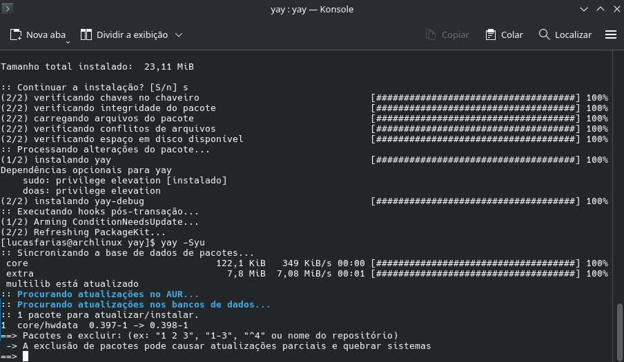 Estou com algumas dificuldades, por exemplo, habilitar o AUR (por mais que não vá usar, ou use só pontualmente); já tentei habilitar o YAY, não consegui. O Pamac eu vou tentar instalar, estava tentando usar o OCTOPI mas não tive sucesso.