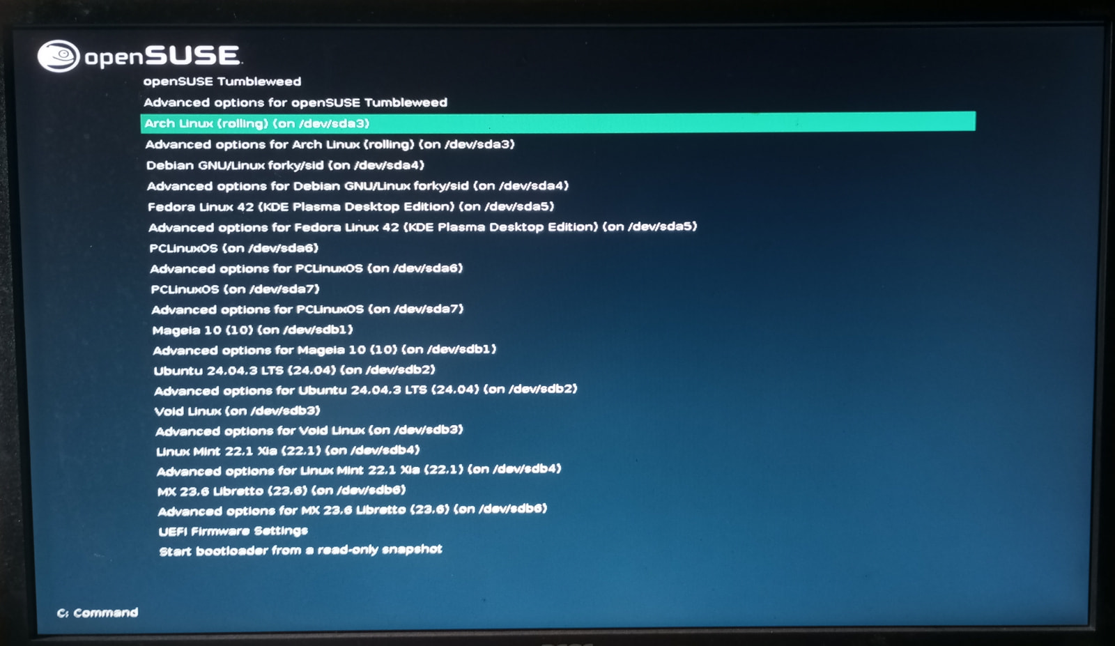 (Se eu usasse o Grub de outra distro, não teria acesso aos Snapshots do openSUSE).