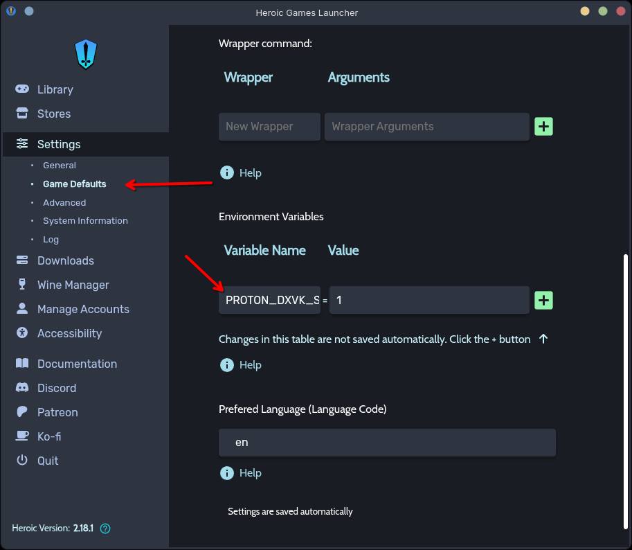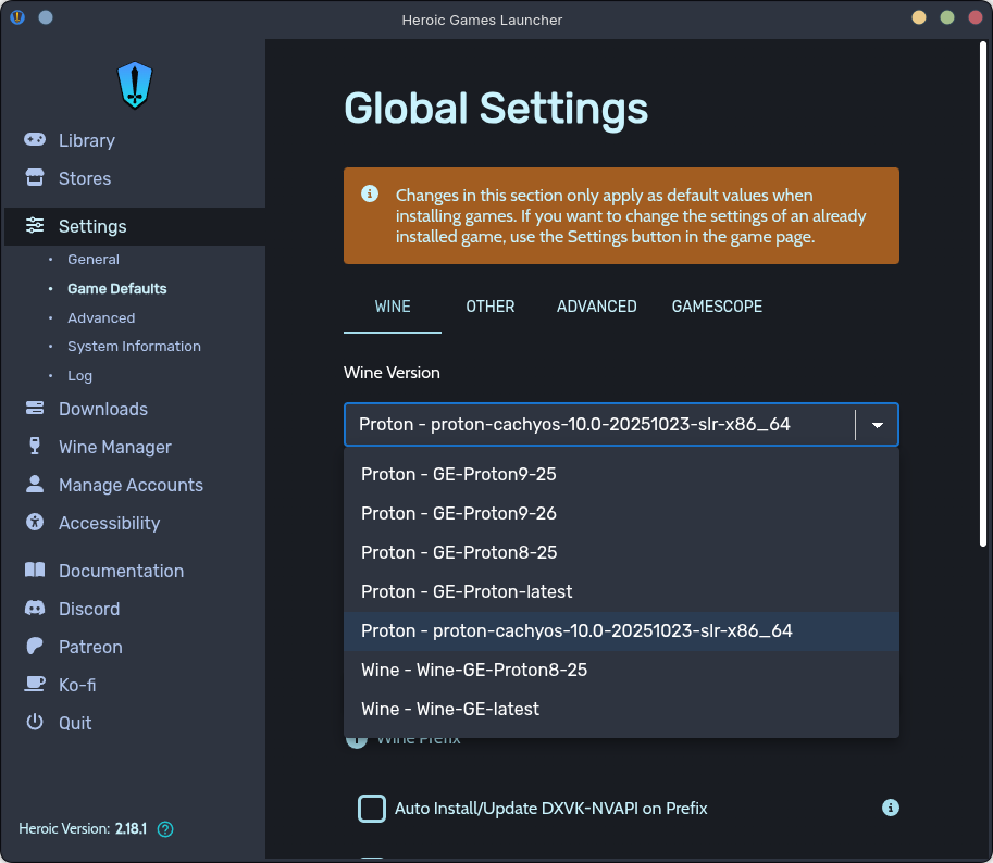 Quando estiver pronta, reinicie o Heroic. Vá em Settings → Game Defaults.