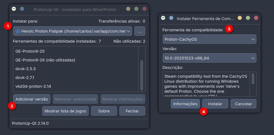 Selecione a opção que começa com “Heroic Proton” em “Instalar para”, e selecione “Proton-CachyOS” como ferramenta de compatibilidade.