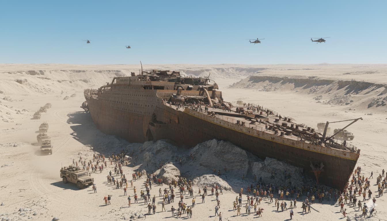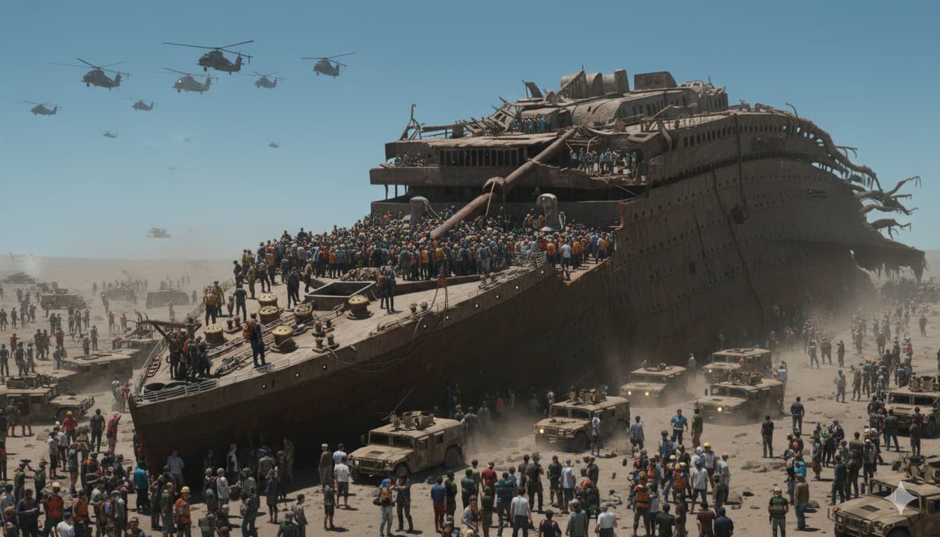 Fiz uma nova modificação nessa imagem adicionando veículos militares como Humvee, pessoas e helicópteros já no oceano completamente drenado e a imagem se tornou essa abaixo.