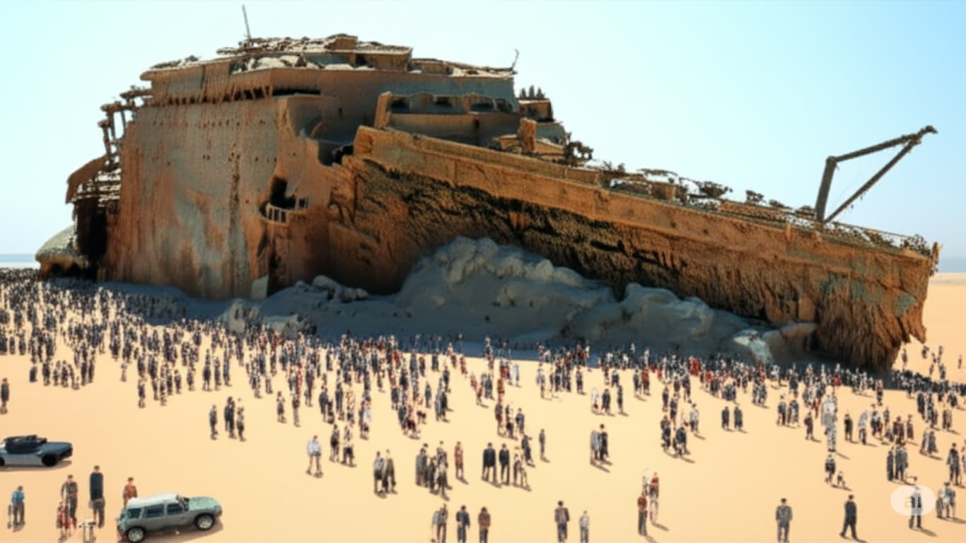 Eu perguntei a ela se eu poderia criar uma imagem peculiar: “O oceano atrãntico norte drenado e seco a luz do dia com centenas de pessoas sobre um lugar que antes era impossível para os humanos a não ser robôs devido as altas pressões esmagadoras do oceano.”