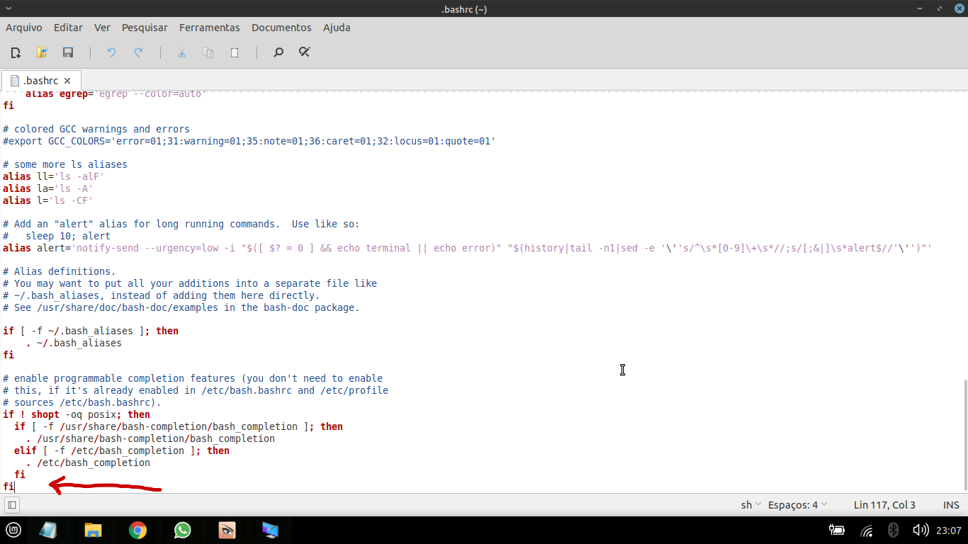 Amigo, como faz pra criar essa linha no arquivo bashrc? Sou iniciante e tenho medo de modificar arquivos assim. Vc poderia deixar isso mais explicado? pq não sei exatamente onde colar o comando (alias wine32=“WINEPREFIX=‘~/.wine32’”) , se é logo embaixo de “fi”, que está em vermelho, ou ao lado.