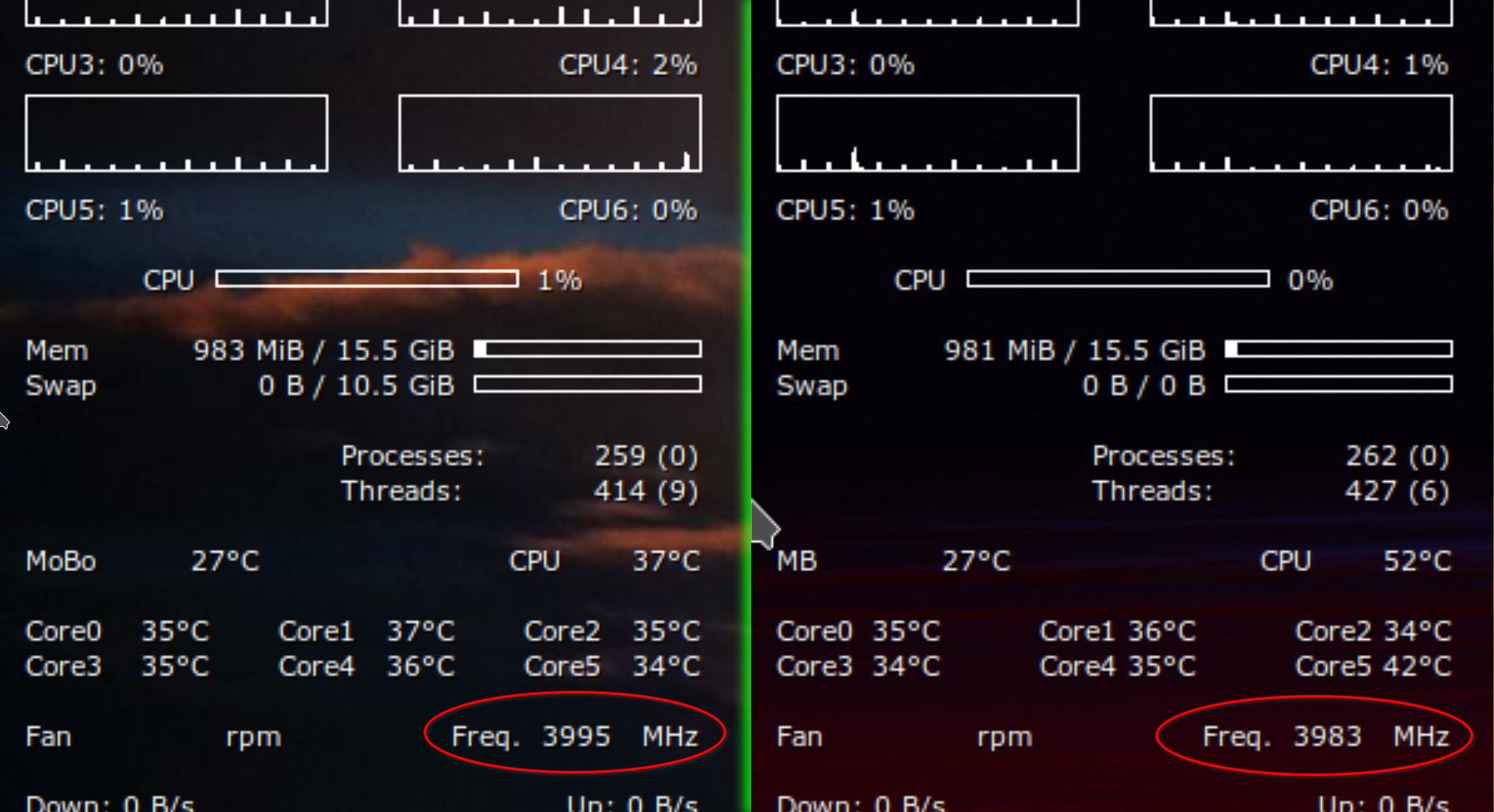 No entanto, o Slackware e o Redcore tinham o hábito de permanecer sempre muito perto de 4.000 MHz – mesmo sem nenhum aplicativo aberto – idle total, desde o boot: