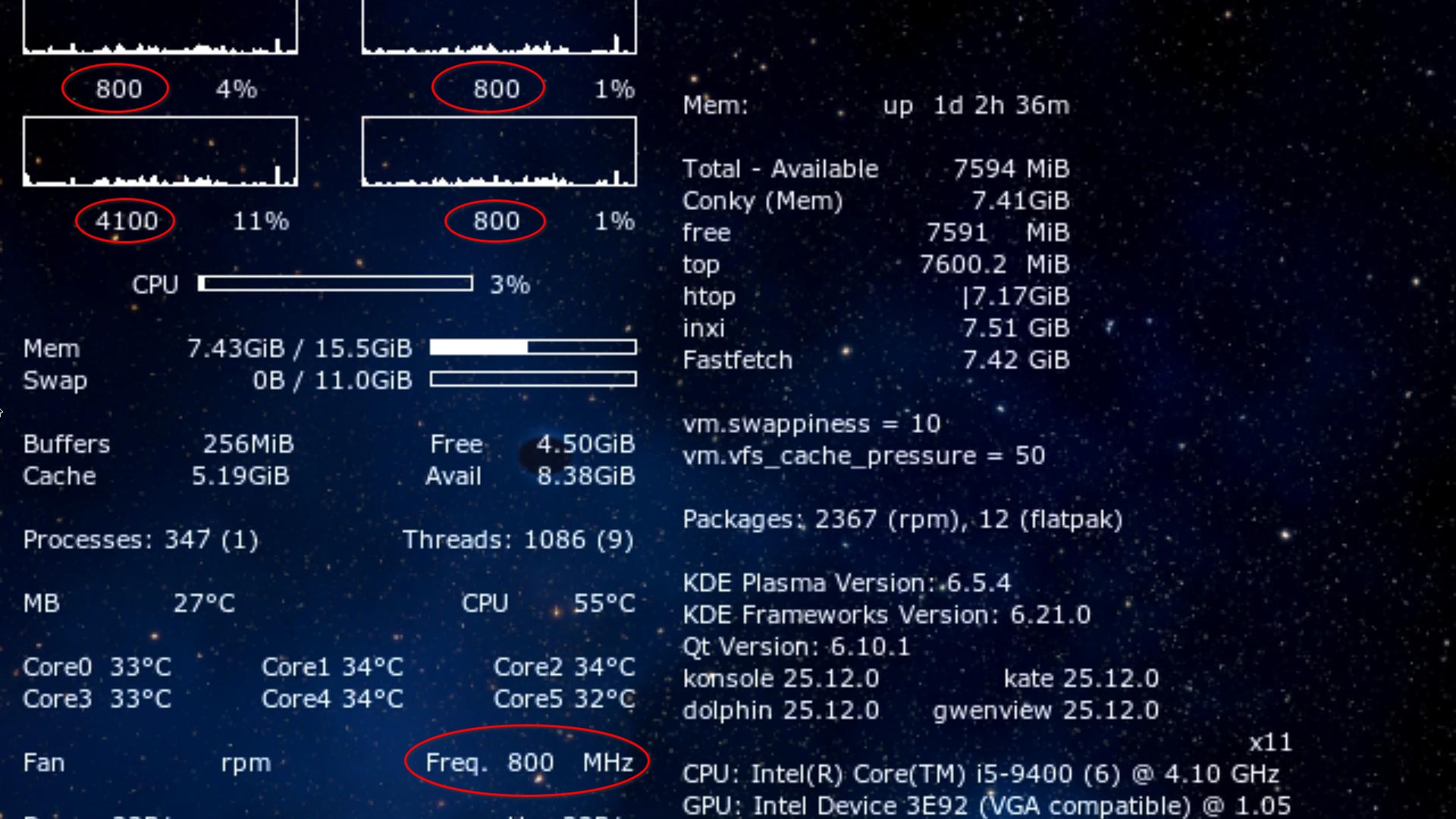 O que percebi é que a maior parte das distros costuma operar no mínimo do meu hardware (800 MHz), 99% do tempo – com pulos ocasionais de 1 segundo (ou menos) até o máximo de 4.100 MHz:
