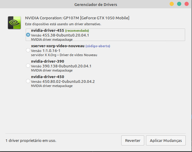Quando eu entro pelo Cinnamon, o mint alega que o driver de vídeo precisa ser configurado. No gerenciador de driver, só aparece o driver da placa de rede.