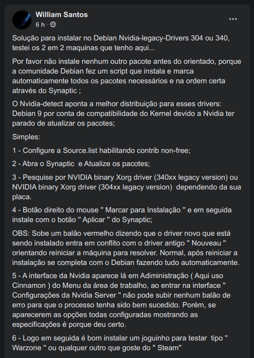 Este assunto foi abordado no grupo “Linux dicas & suporte” do Facebook, pelo membro William Santos. Eu gostaria de postar o link aqui, mas não consegui obter o link da publicação, então vai screenshot mesmo: