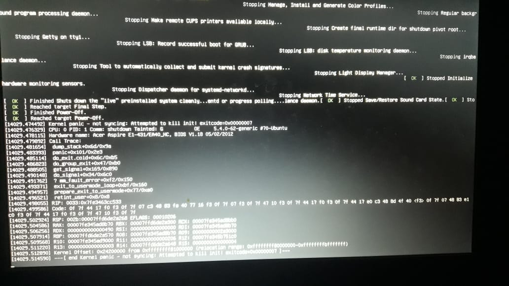 Quando eu falei que fica por poucos segundos foi em relação a essa imagem. Até a parte do “Stop Network Time Service…” demora alguns segundos para as próximas linhas aparecerem. Aí quando chega em “Reached target Power-Off” ele tem um delayzinho também (as vezes desliga normal, ou como na imagem, dá o kernel panic).