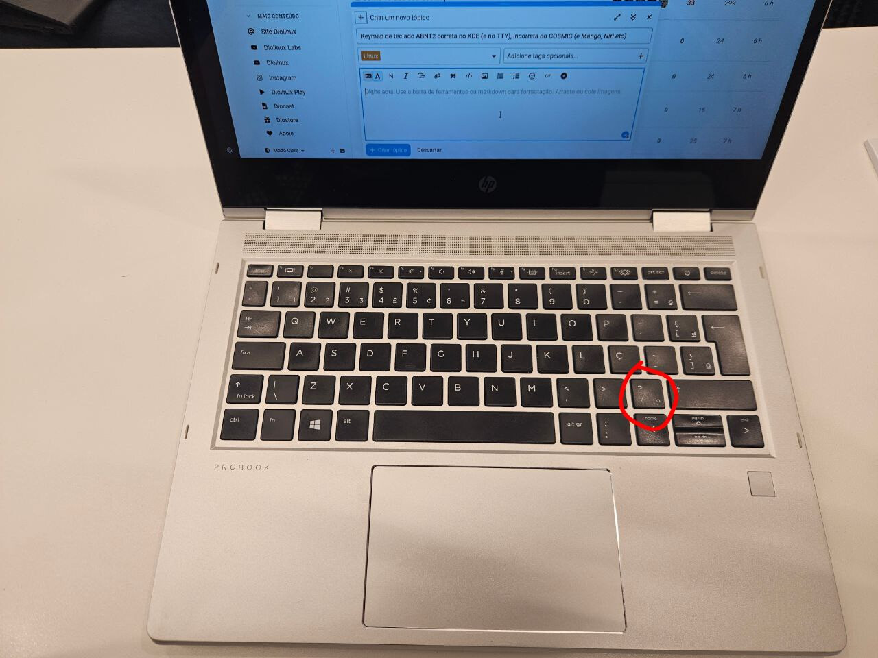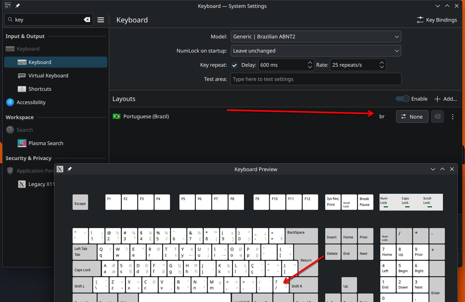 Tecla “? / °” no KDE (Wayland) apresenta resultados esperados.