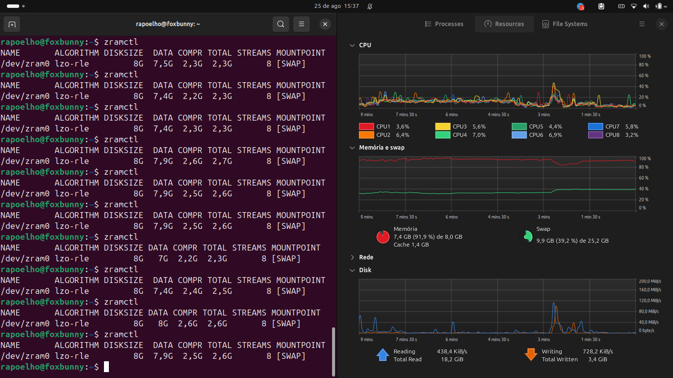 Fiz um pequeno teste, abrindo um monte de abas no Firefox, para fazer o sistema consumir toda a RAM e usar a zRAM e logo depois abri alguns outros programas. Eu já tinha 16 GB de Swap no SSD e configurei uma zRAM de 8 GB. E esse foi o resultado: