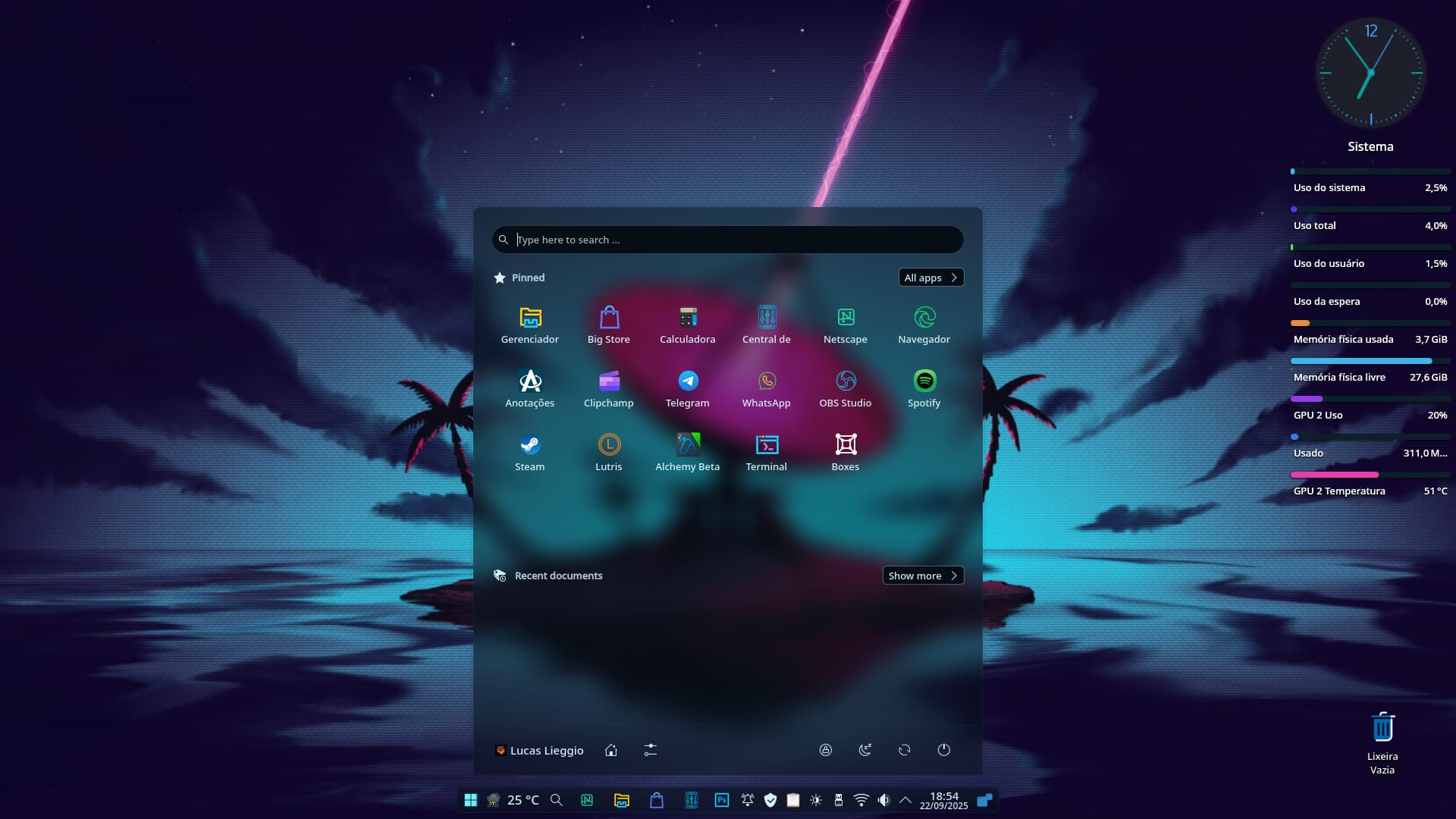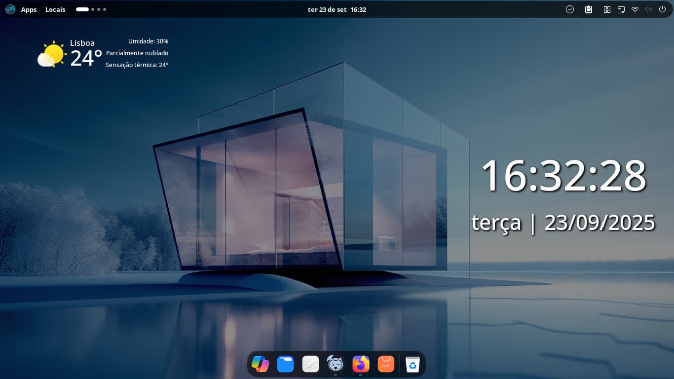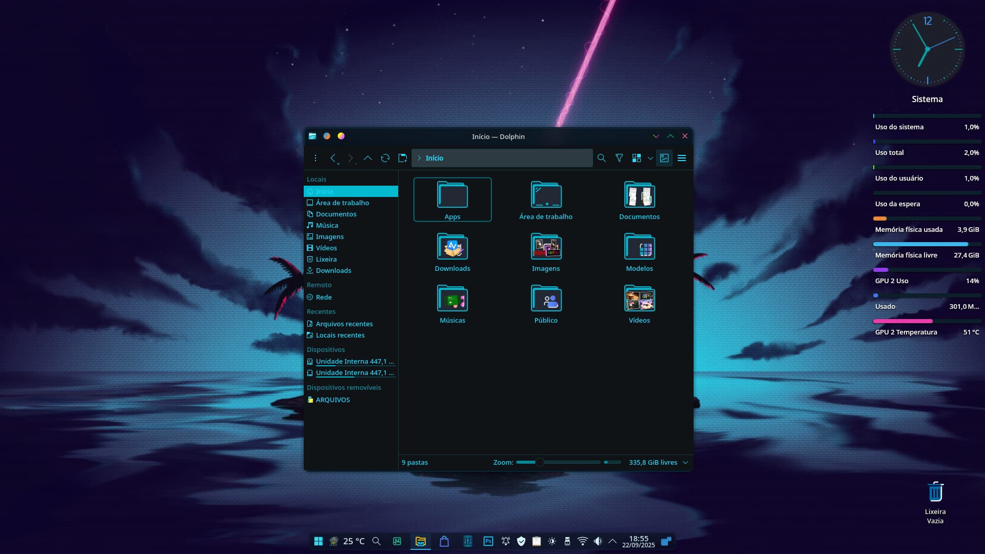 Esse customização eu fiz com uma pegada mais minimalista e estilo synthwave / vaporwave. Ficou um ambiente gráfico muito suave aos olhos e muito bom de trabalhar.