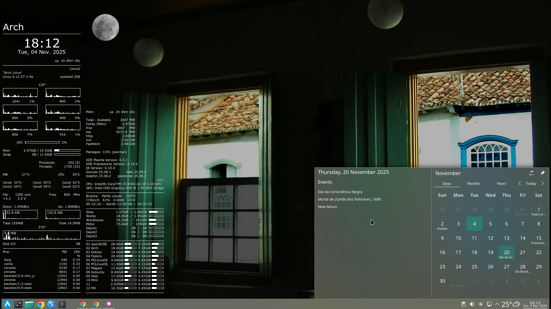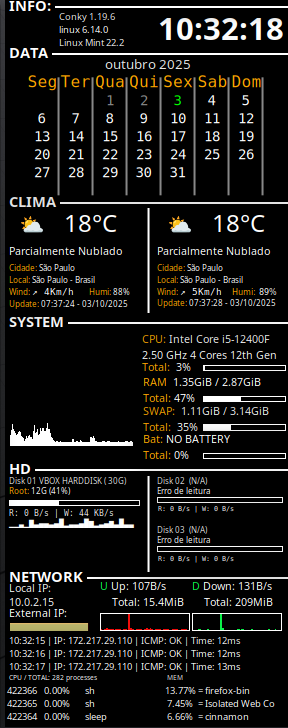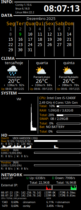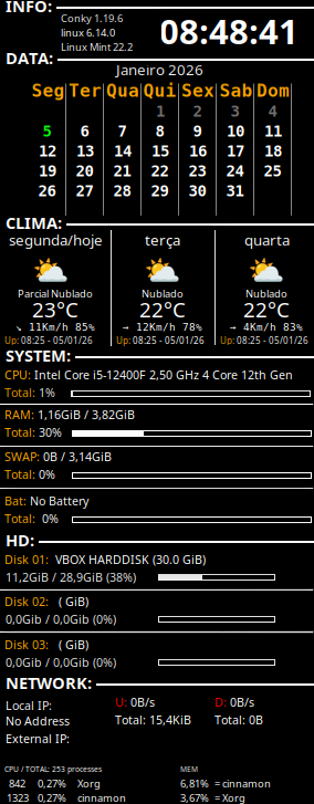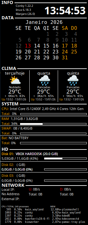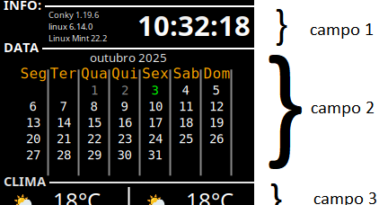 1- INFO, nela tem a versao do conky, o nome do usuario, a distro usada e o relogio