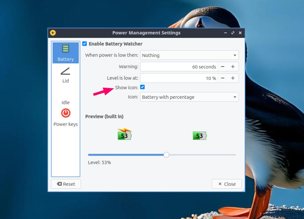 Mesmo assim, eu dei uma pesquisada aqui no manual do LXQt, e o ícone de energia tem um visual bem “esquisitinho”, para dizer o mínimo, mas pode ser configurado para ser um pouco mais tradicional.