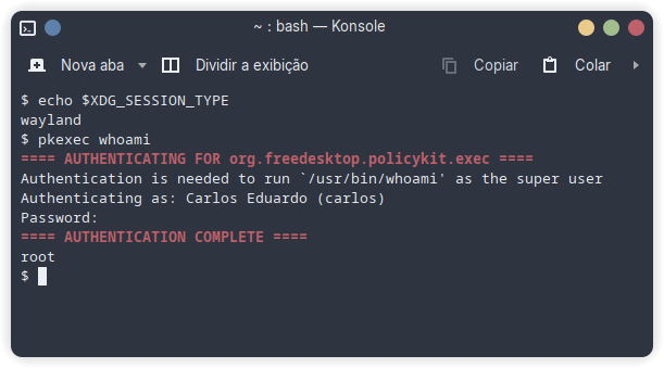 Note que sudo e pkexec por padrão não passam informações de como se conectar ao D-Bus para os programas que iniciam como root.