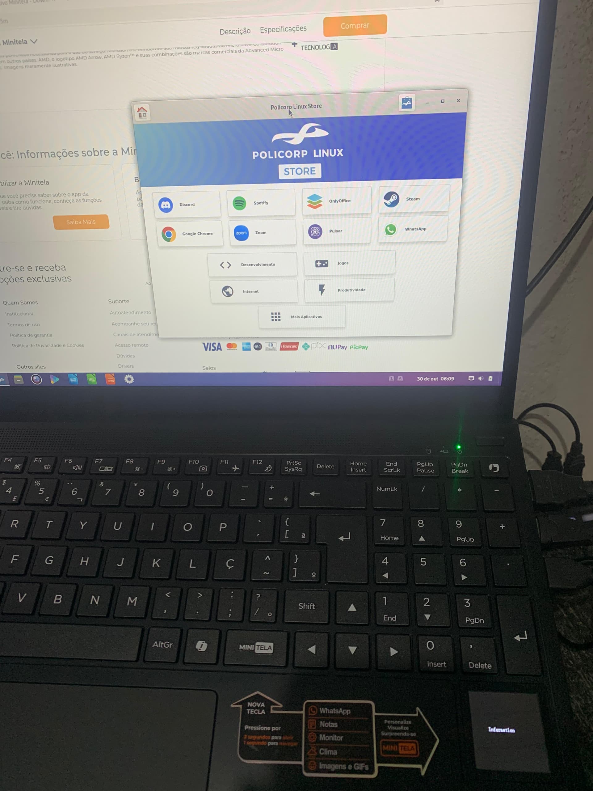 Quando comprei o computador, ele veio com o sistema operacional chamado Policorp Linux, e, surpreendentemente, a telinha funcionava perfeitamente.