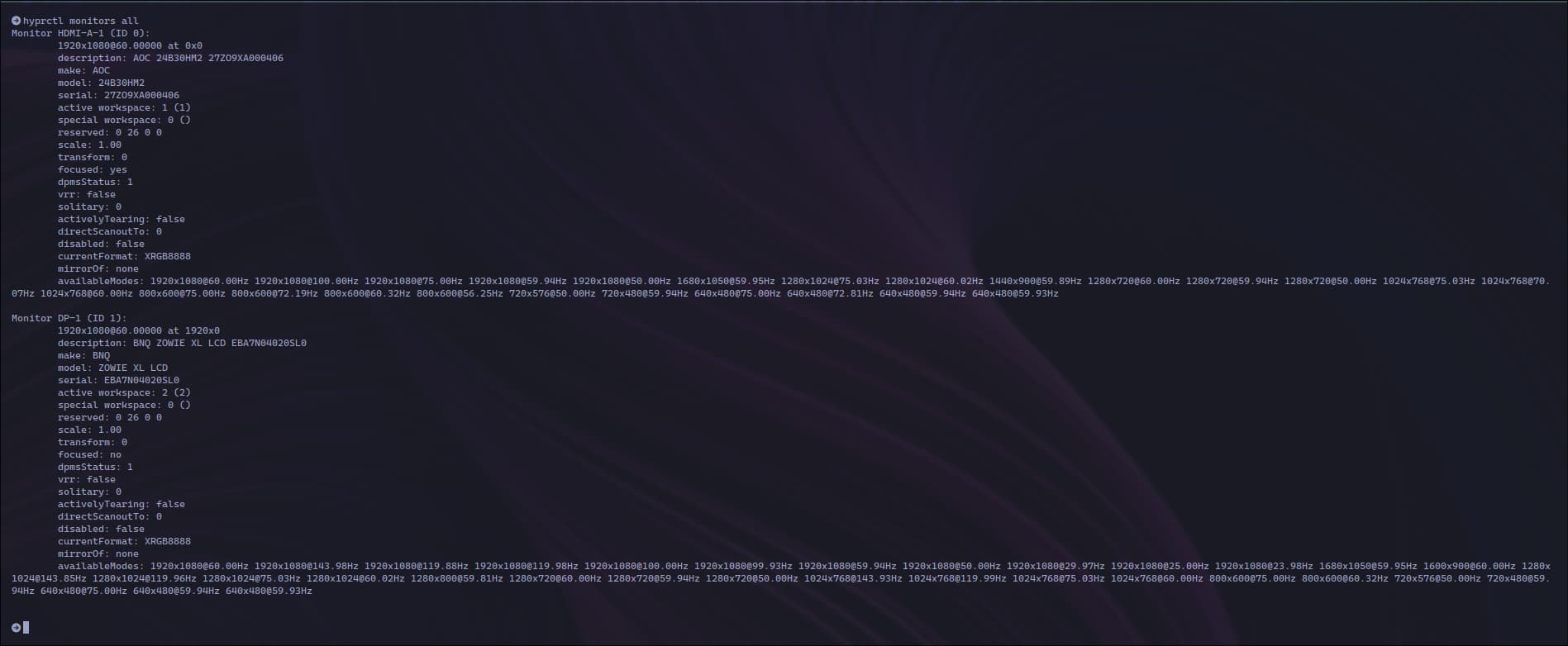 Estou com um problema usando o hyprland no archlinux, onde meu segundo monitor se mantem desligado o tempo inteiro, e o monitor primario, por mais que ligado aparentemente nao esta sendo reconhecido quando rodo o comando hyprctl monitors all
