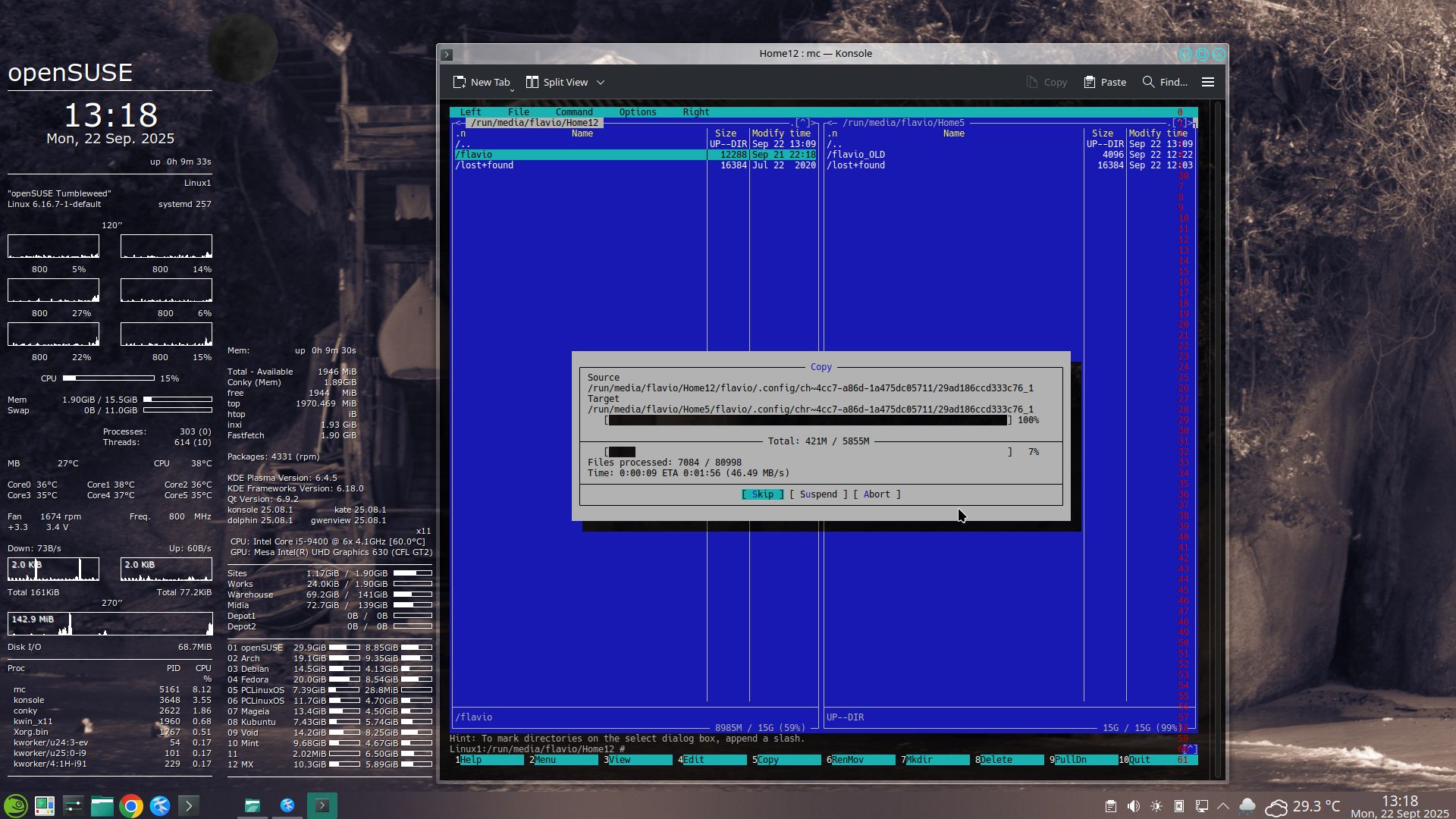 Por exemplo, bobeei e deixei o instalador formatar minha partição Home5. – Criou numa pasta pessoal “flavio” zerada, que não me interessava. – Carreguei outra distro (openSUSE, Linux1 no meu PC), renomeei a pasta como “flavio_OLD”. – Usando o Midnight Commander (mc) como super-usuário (root) copiei minha pasta pessoal da partição Home12 (do MX Linux):