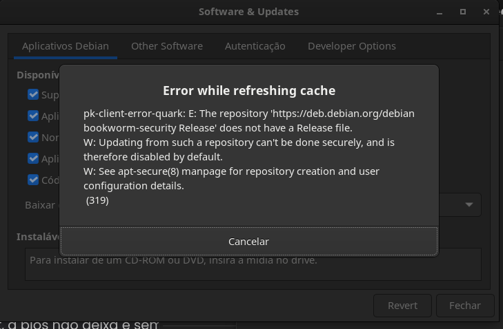 Gostaria que mencionar que o erro era justamente que o endereço https://deb.debian.org/debian/dists/bookworm-security não existe. A fonte correta é https://security.debian.org/debian-security/dists/bookworm-security. Fazendo esta correção, passo a ter acesso às correções de segurança do Debian. Não é hoje que reinstalo o sistema. E espero que tudo esteja bem quando o Debian 13 Trixie for lançado. Obrigado a todos que dedicaram seu tempo a me ajudar.