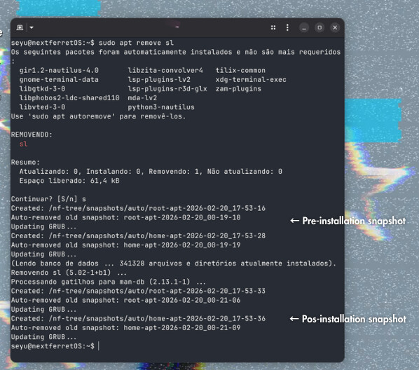 nas primeiras versões nem btrfs snapshot manager tinha,e eu dependia da boa vontade da bateria do meu notebook e da fonte,então resolvi criar o NF-Tree:o snapshot manager,e então integrar ao apt,mudei na versão q vai sair o instalador pra ser GUI,etc