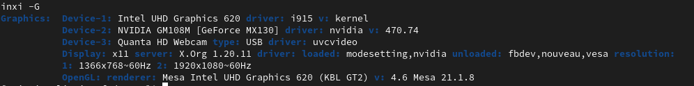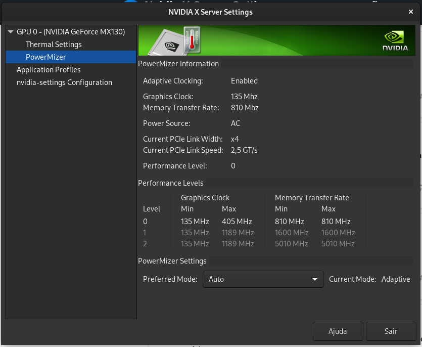 Olá, a placa é uma Geforce, segue o link da Nvidia GeForce MX130 dedicadas nos notebooks |NVIDIA. Coloquei as prints com a versão do drive e Kernel. Quando testei o Pop OS aparecia várias outras opções, e quando usava Windows tinha um mooonntee, agora não aparece nada.