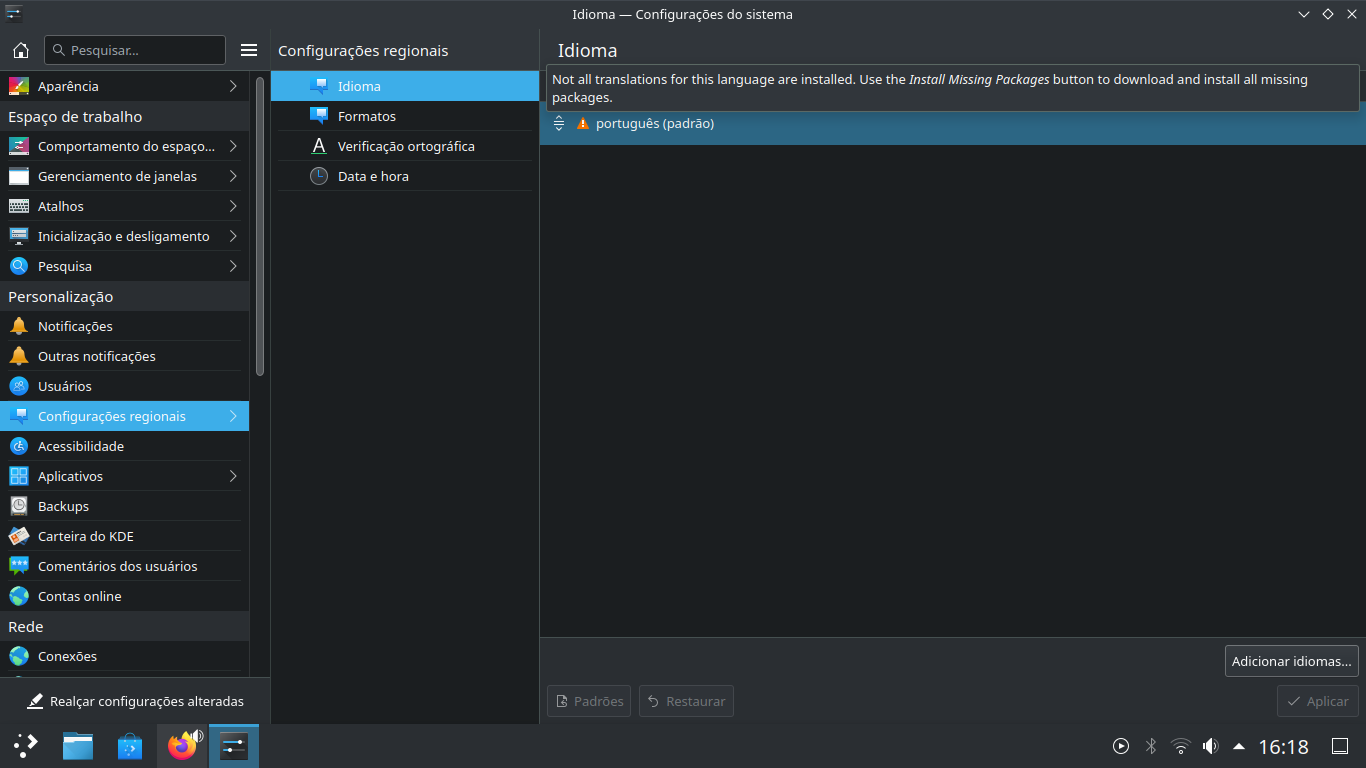 Após instalar o sistema e ir às configurações de idioma é acusado que faltam pacotes de idioma para instalar. Não achei a opção na configuração para completar os idiomas, no Gnome basta ir em idiomas instalar o que falta por meio de um botão. No KDE Plasma tive que baixar o Synaptic e procurar pacotes ‘pt-br’, ‘br’, ‘portuguese’ e etc para instalar o idioma de alguns programas como LibreOffice e Gnome Disks, por exemplo. E mesmo assim o alerta ainda continua. Mas os programas que precisei foram traduzidos após a instalação de alguns pacotes no Synaptic.