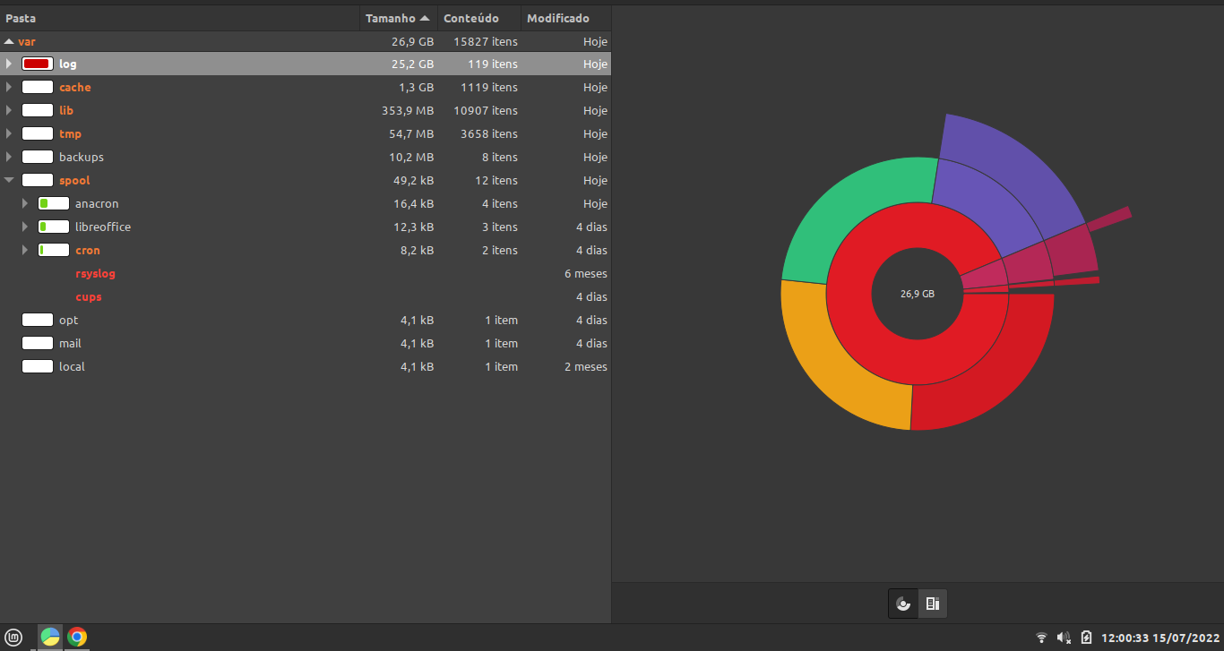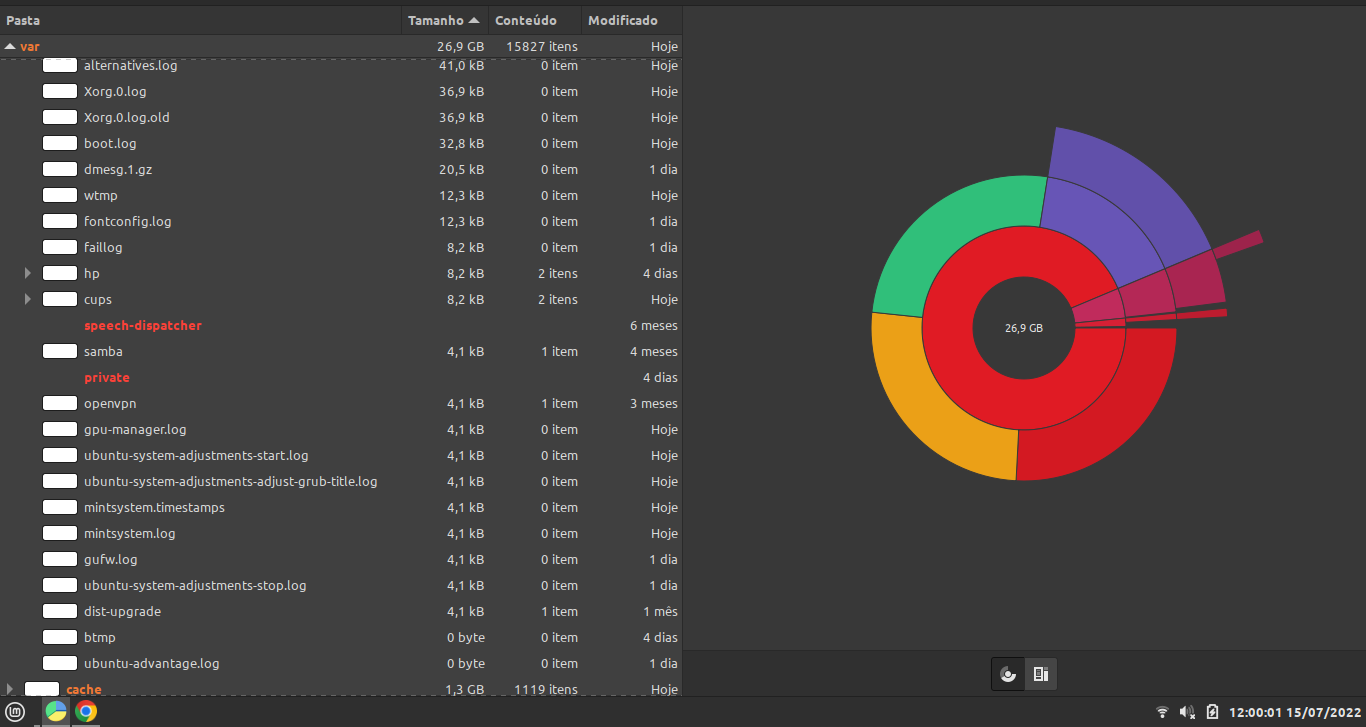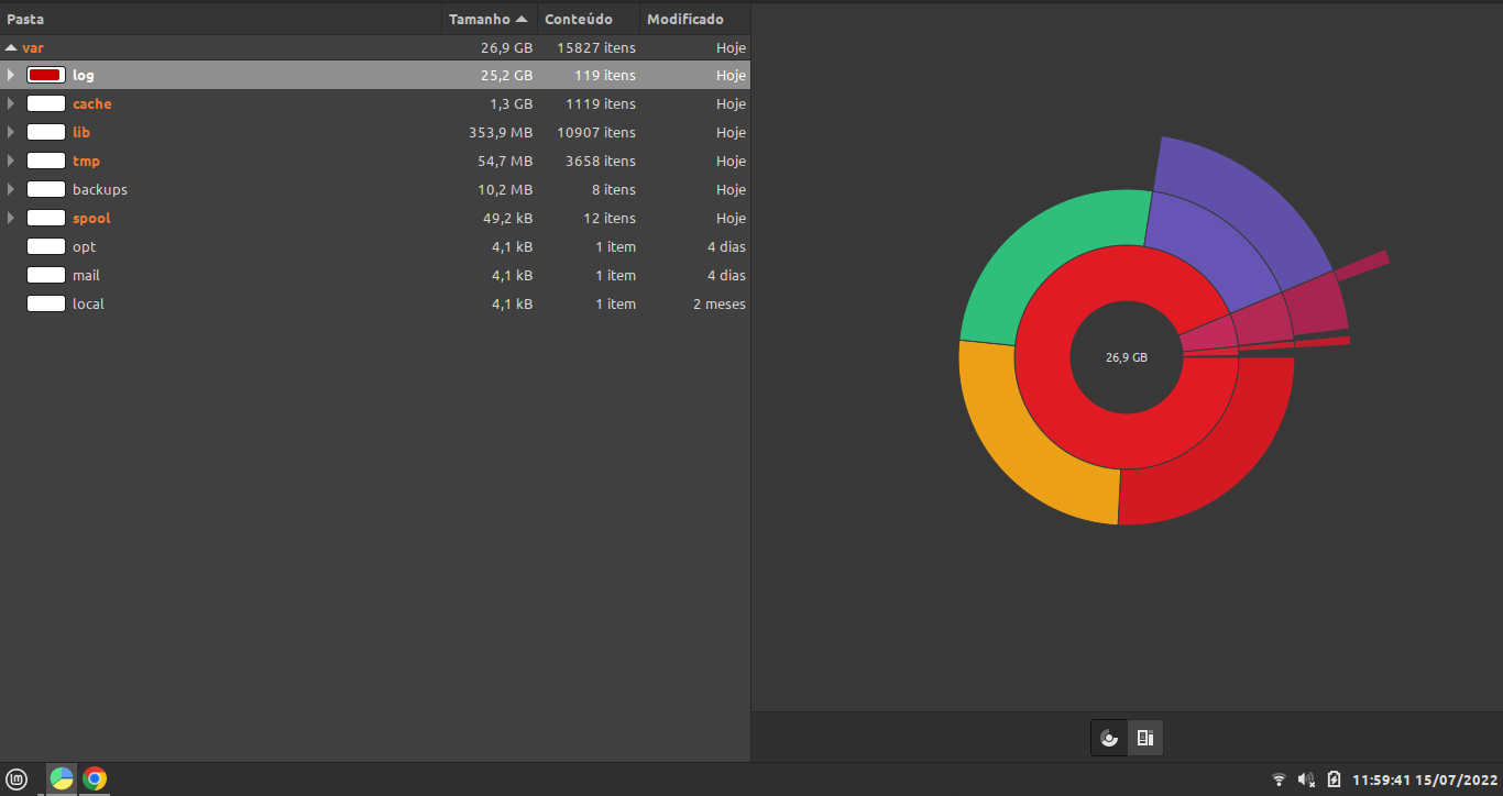 eu olhei aqui os maiores arquivos dentro da pasta log são: ufw.log = 1.5gb, kern.log = 1.5gb, syslog=1.5gb e a pasta journal com 4,3gb. esses tamanhos são no momento do post. vou verificar se vão alterar.
