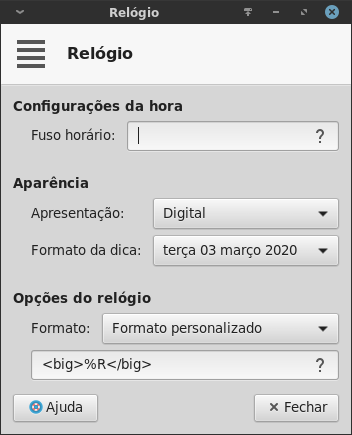 A fonte fica a sua escolha, você pode usar a padrão do sistema ou não. A cor, se não quiser, não precisa alterar, o relógio irá utilizar a cor do tema que você está usando. Mas, caso deseje uma cor específica, use o gimp ou algum seletor de cor para saber o código certo da cor desejada. E o formato do relógio vai depender do seu gosto. Eu prefiro utilizar somente o “%R” que é o nosso formato tradicional de relógio digital.