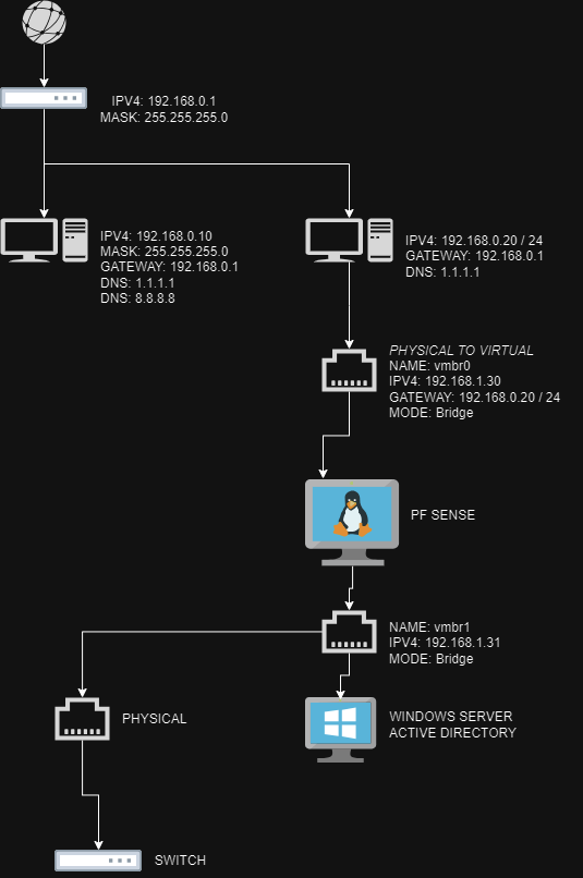 Começei a estudar redes a um tempo atras, e queria desenvolver uma rede cliente servidor para minha casa, usando recursos como Firewall Pf Sense e Controladores de Domínio, windows server e Active Directory!