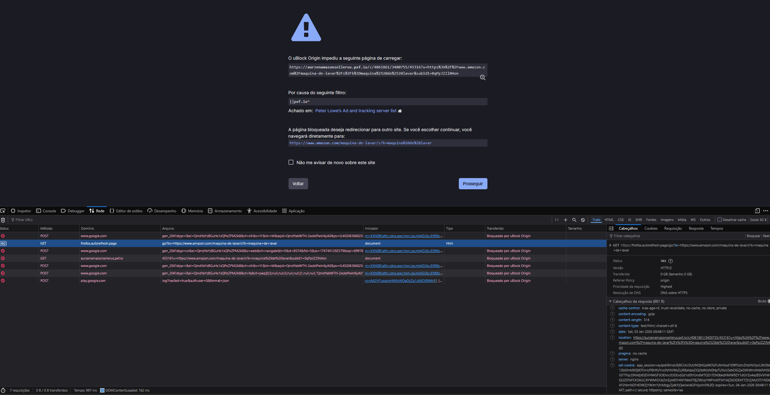porém comecei notar que minhas pesquisas para comprar algo, começou ser redirecionada para alguns links estranhos e depois voltava para a pagina do produto.