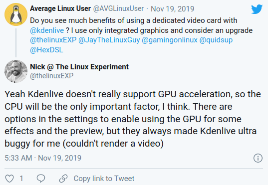 Tradução : você vê muitos benefícios em usar uma placa de vídeo dedicada com o @kdenlive? Eu uso apenas gráficos integrados e considero uma atualização @thelinuxEXP@JayTheLinuxGuy@gamingonlinux@quidsup@HexDSL