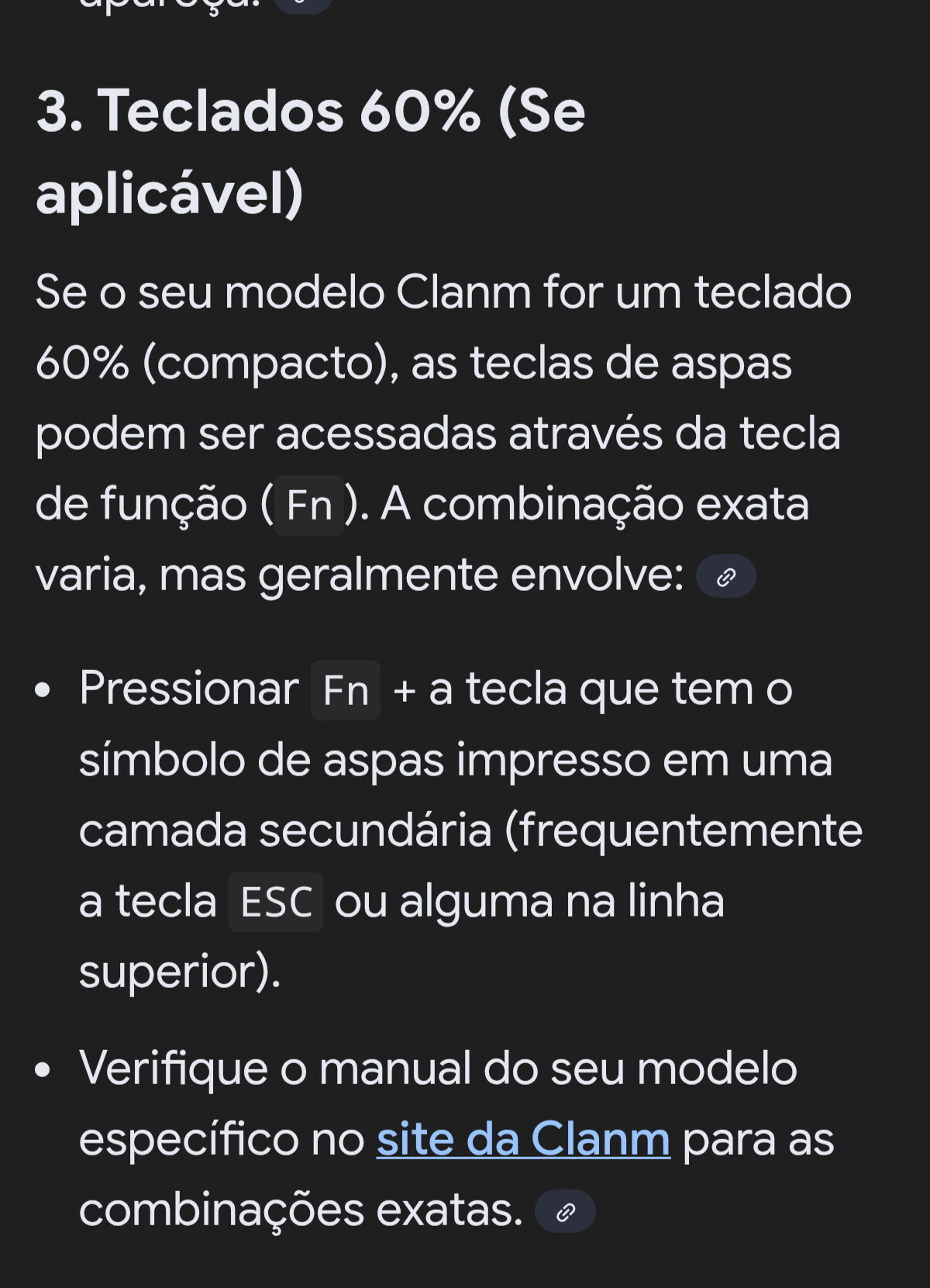 Bom, comprei um teclado 60% da clanm e esta muito dificil, eu uso o peppermint os e mexo com programação entao eu utilizo muito as aspas duplas, mas por algum motivo ela nao vai, eu ja tentei usar Fn + Shift + esc(as aspas ficam na tecla esc), ou Fn + esc, ou Shift + esc, simplismente nao vai, so vai aspa normal, mas preciso usar as duplas, o teclado e snow walker v2 60%, ja tentei mudar layout mas nao vai, se alguem puder me ajudar eu ia agradecer muito, ja tentei trocar de sistema, mas da o mesmo problema.